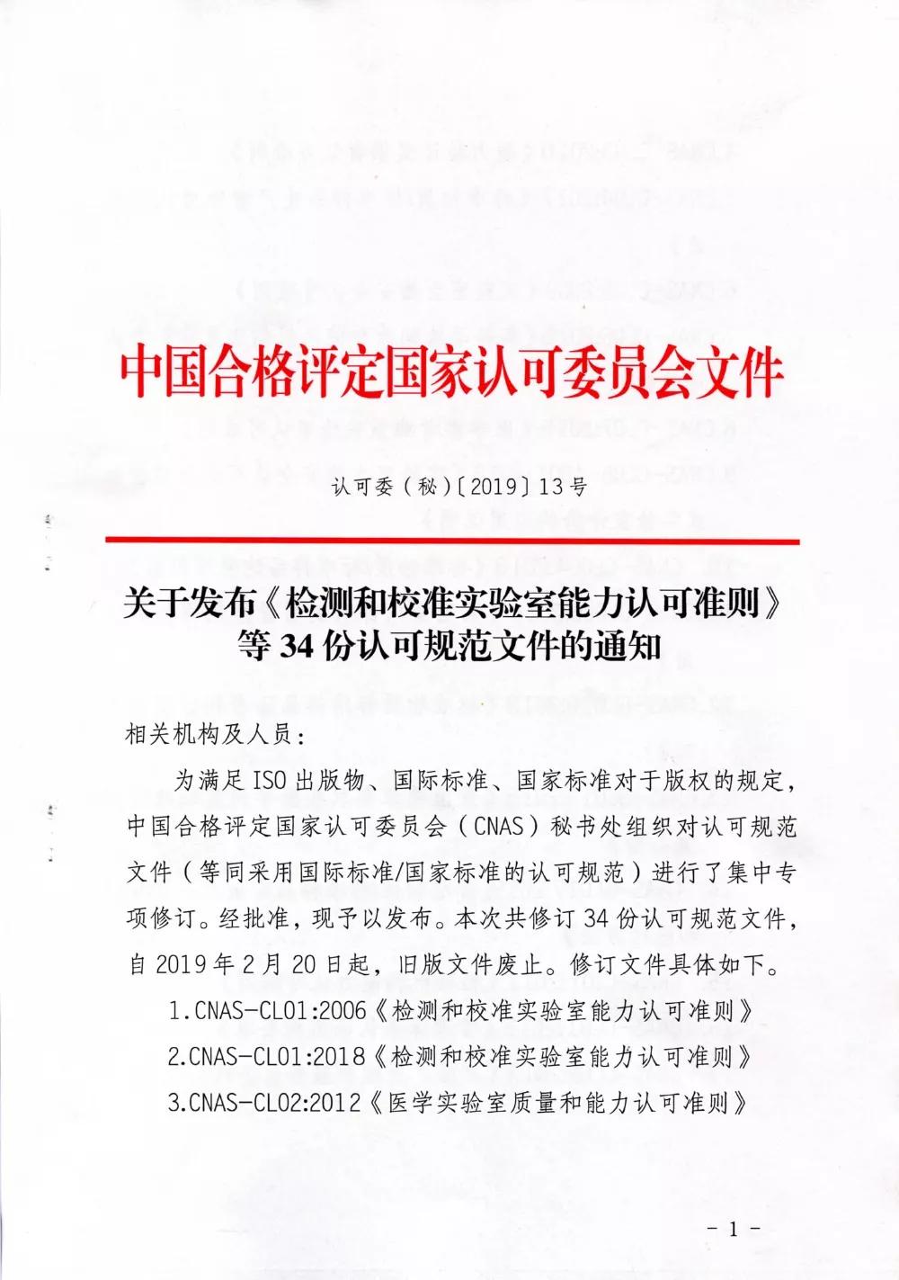 据中国合格评定国家认可委员会官网今日消息,CNAS组织对认可规范文件进行了集中专项修订,现予以发布。本次共修订34份认可规范文件,自2019年2月20日起,旧版文件废止。